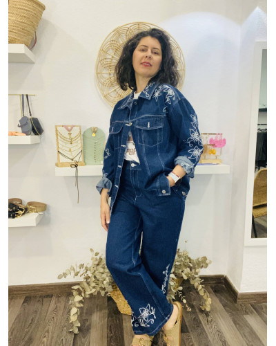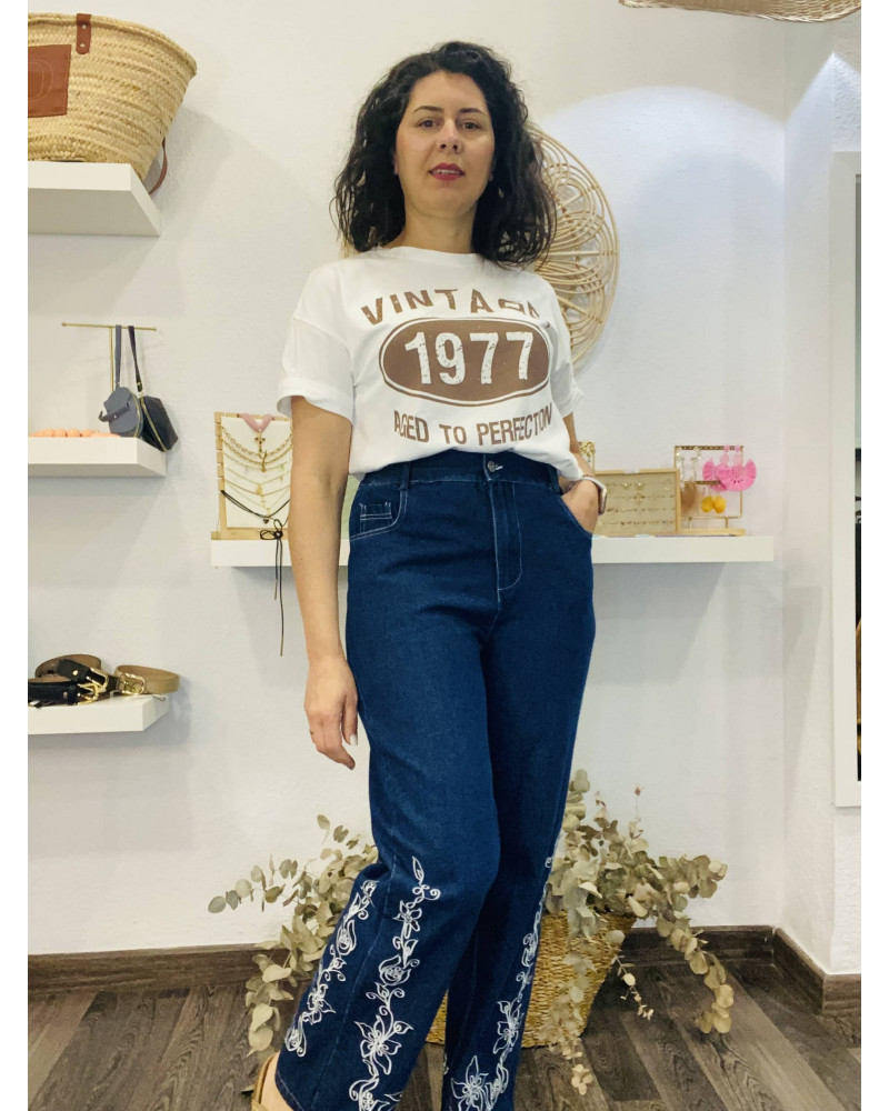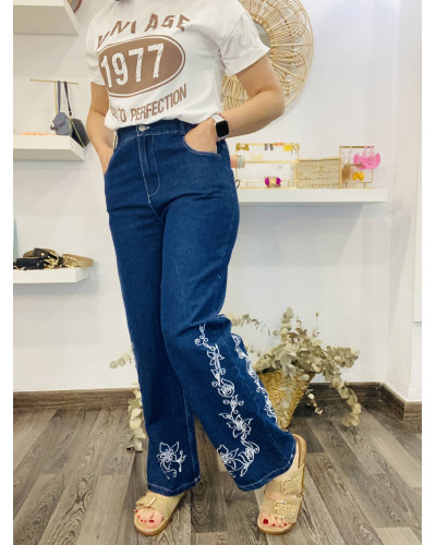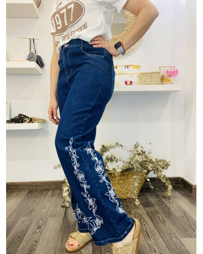 Pantalón vaquero con bordados. Cierra con botón pero la parte de atrás de la cintura lleva goma.