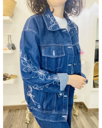 Cazadora vaquera con bordados estilo oversize, cierre con botones.