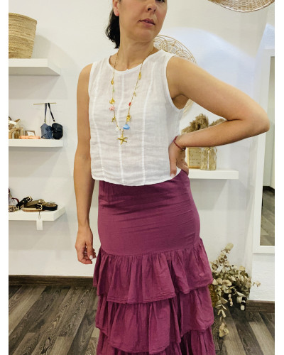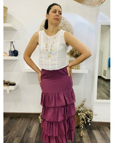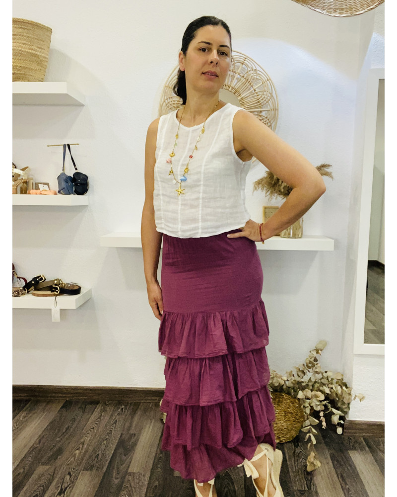 Falda corte midi de volantes con goma en la cintura y también con forro, esta falda te ciñe la figura. Su tejido fluido es espectacular.