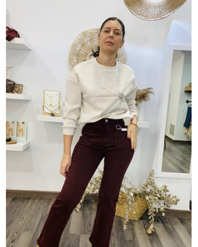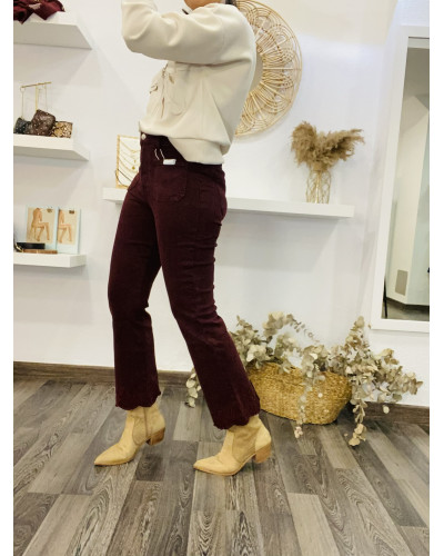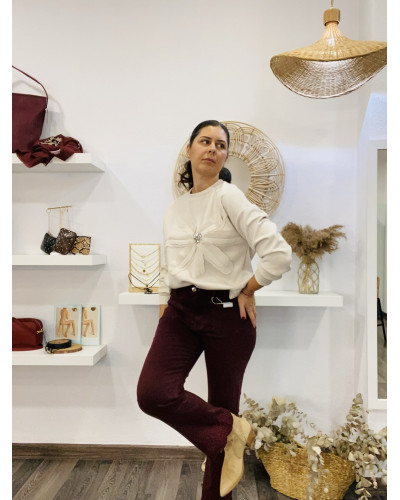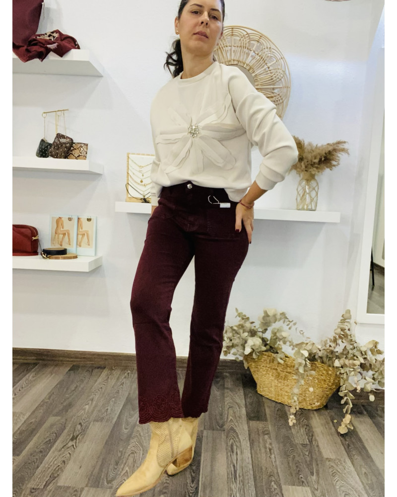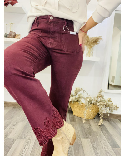 Eleva tu estilo con este pantalón burdeos. Su diseño se transforman en una prenda especial gracias al bordado floral en el bajo, que aporta un aire delicado y sofisticado.
