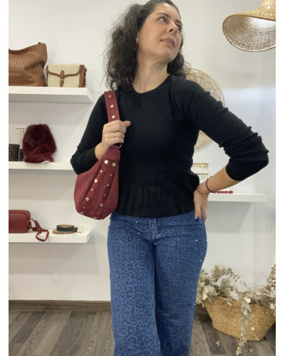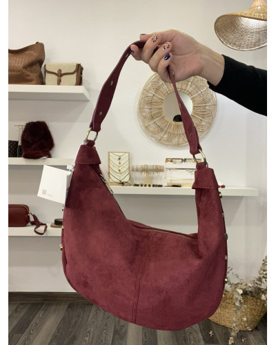Este bolso de ante burdeos con tachuelas doradas es el complemento perfecto para elevar tu estilo. Su textura suave y su diseño amplio lo hacen cómodo y práctico para el día a día, mientras que los detalles metálicos añaden un aire moderno y elegante. Combínalo con looks casuales o más sofisticados y conviértelo en tu aliado favorito.