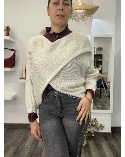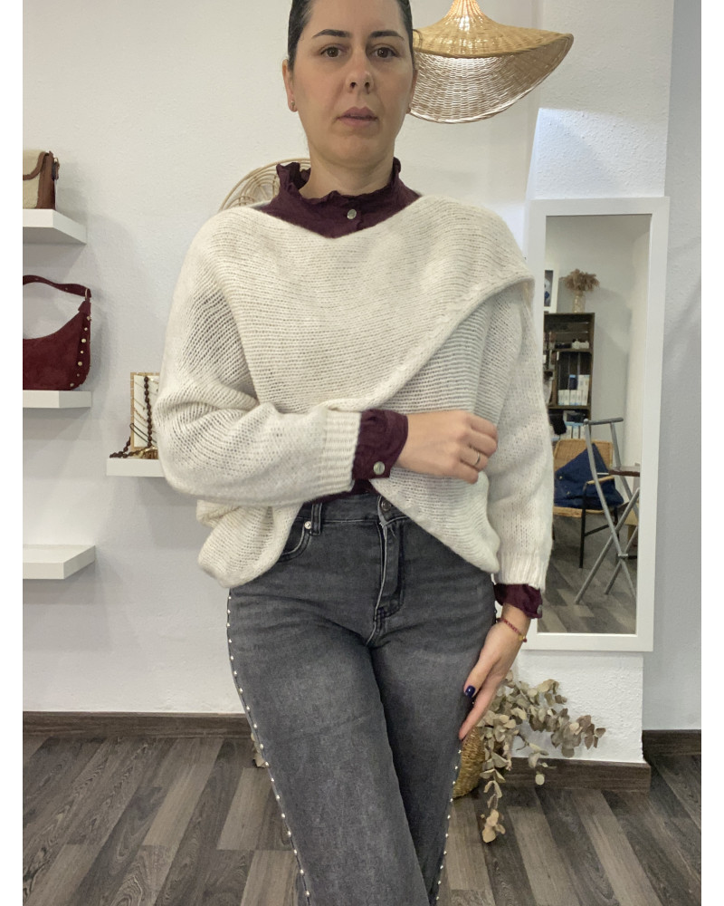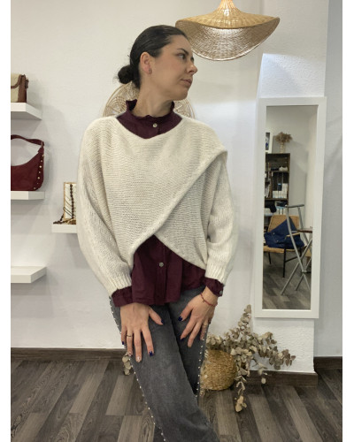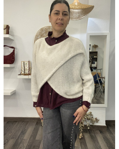 El jersey blanco roto oversize ( capa) es la prenda perfecta para combinar estilo y comodidad. Su diseño amplio y su tejido de punto suave y abrigado lo convierten en un imprescindible para los días fríos.