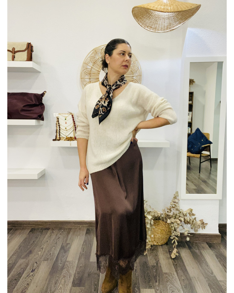 Falda midi de satén en color marrón chocolate con detalle de encaje en el bajo. Su tejido fluido y su brillo sutil aportan un toque elegante y femenino, ideal para combinar con jerséis de punto, camisas o botines en los días de otoño. Cintura elástica para un ajuste cómodo y favorecedor. Una prenda versátil que puedes llevar tanto looks casuales como para ocasiones especiales.