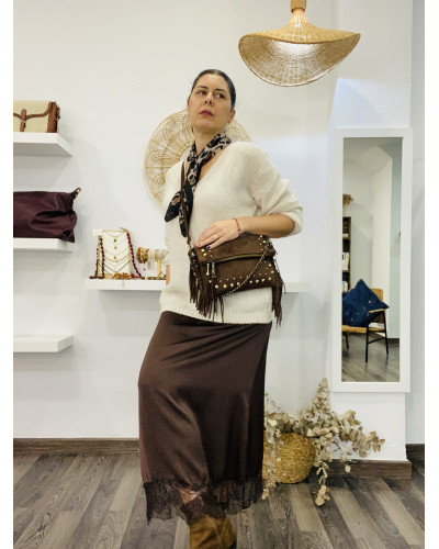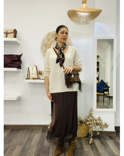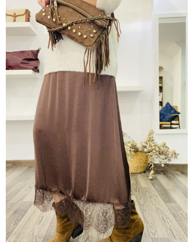 FALDA SATEN COMBINADA CON ENCAJE CHOCOLATE