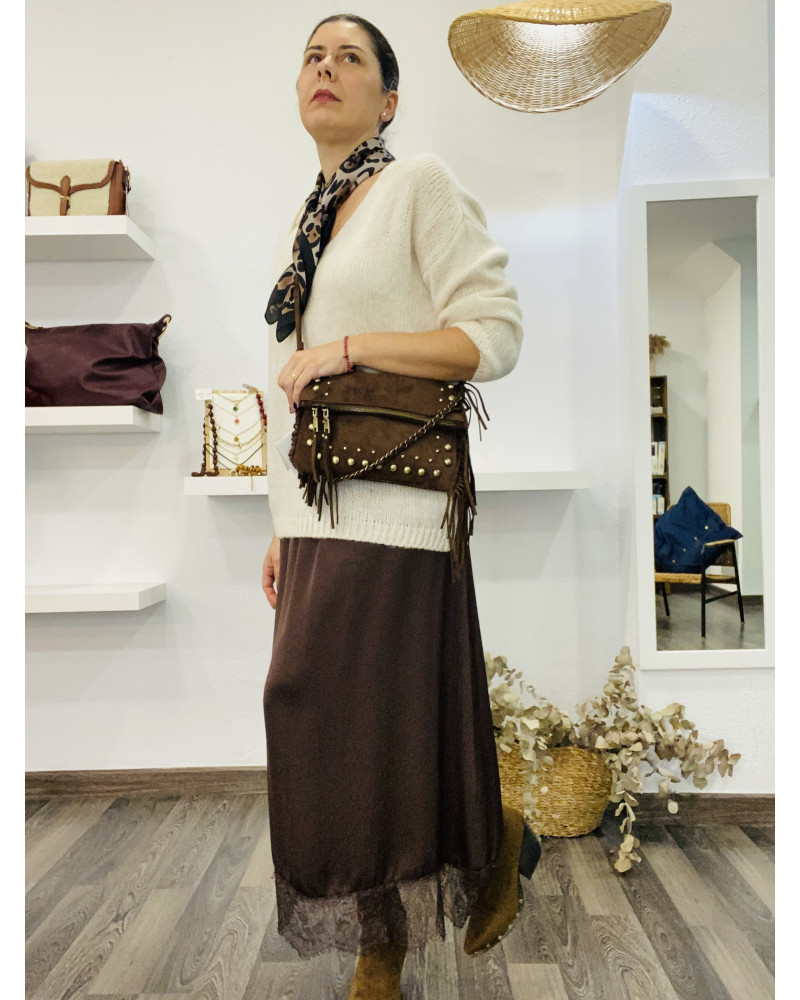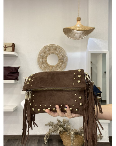Este bolso de ante marrón chocolate combina estilo boho y elegancia urbana. Su diseño con tachuelas doradas y flecos laterales lo convierte en el complemento perfecto para dar un toque chic a cualquier look.