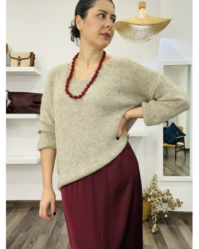 Jersey de punto calentito, ideal para los días más fríos. Su diseño con cuelo de pico favorece la silueta y aporta un toque femenino y relajado.