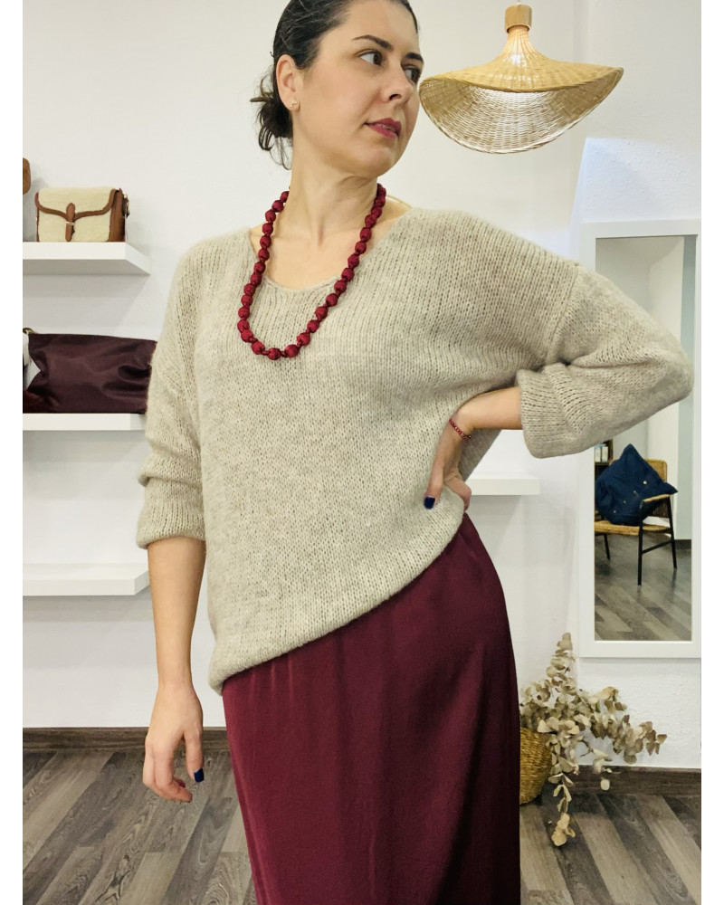 Collar de cuentas de tela en todo burdeos, ideal para aportar color y personalidad a tus looks. Su diseño ligero y original combina elegancia y estilo boho, perfecto para lucir con camisas, vestidos y jerséis.