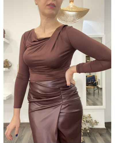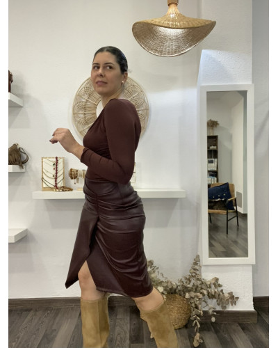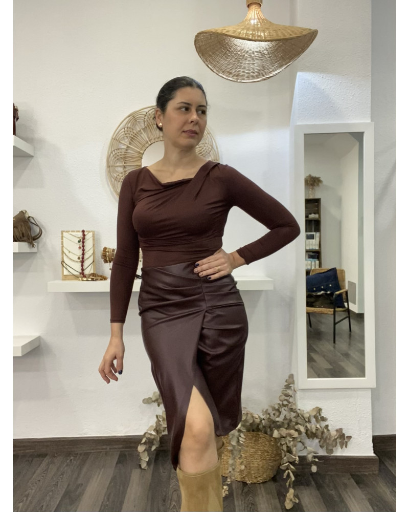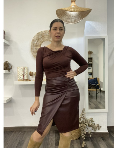 Sofisticada y con un toque atrevido, esta falda lápiz en efecto piel es perfecta para elevar tus looks de oficina o tus salidas más especiales. Su diseño cruzado en la parte frontal realza la silueta y aporta un detalle elegante y moderno.