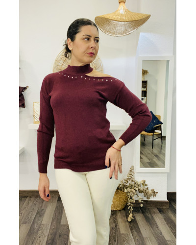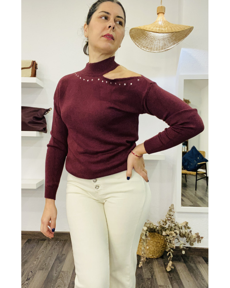 Este jersey color fresa combina elegancia y originalidad gracias a su diseño asimétrico con abertura en un hombro y pequeños brillantes decorativos en el escote.