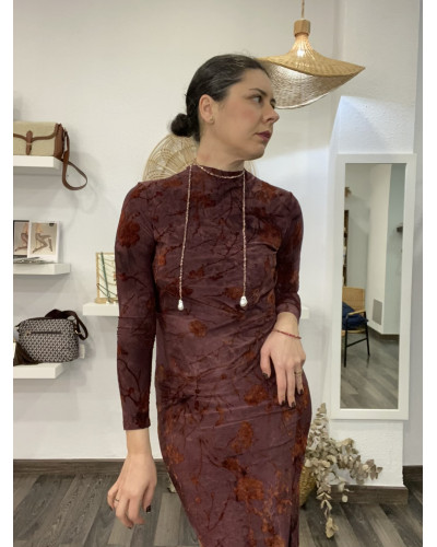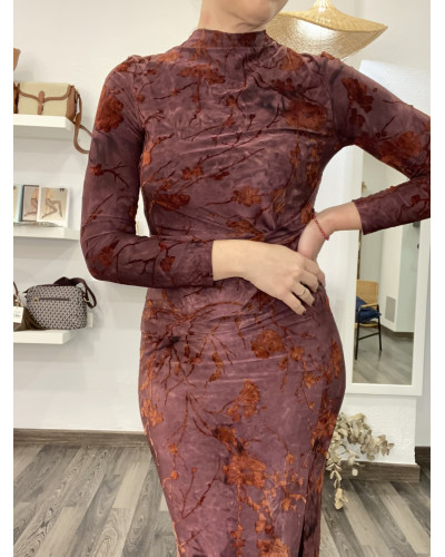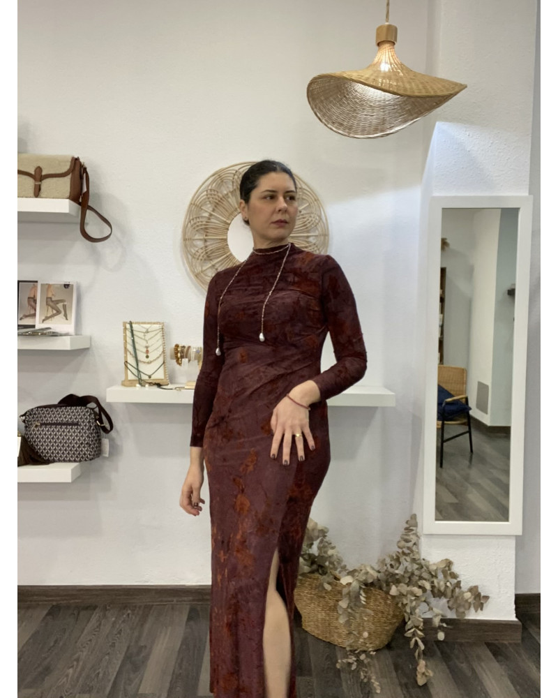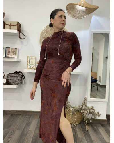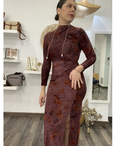 Su estampado en tonos marrón/chocolate y la abertura lateral aportan un toque elegante y sofisticado, ideal para eventos, fiestas, cenas especiales o celebraciones. Una prenda perfecta para quienes buscan un look femenino, actual y con personalidad.