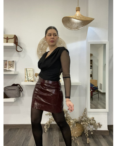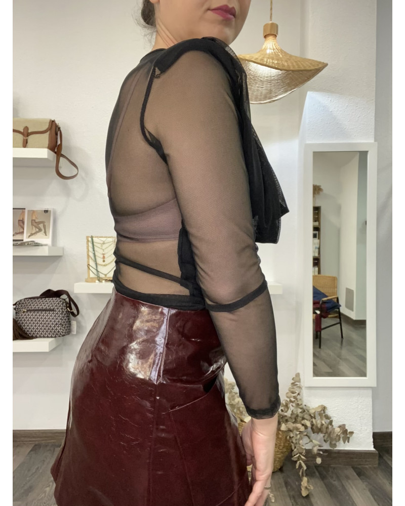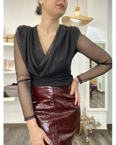 Blusa negra tejido semitransparente con espalda sin forro, una prenda sofisticada y muy femenina. Presenta un elegante escote drapeado en la parte delantera y mangas largas de tul que aportan ligereza y sensualidad. La espalda sin forro realza el diseño y la convierte en una opción ideal para looks de noche o para elevar cualquier conjunto especial.