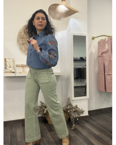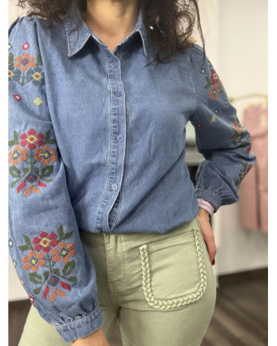 Camisa denim suave en color azul , con un delicado bordado floral multicolor en las mangas que aporta un toque femenino y especia. Diseño de corte recto, con cuello clásico y cierre de botones frontales, perfecta para llevar tanto por dentro como por fuera.
