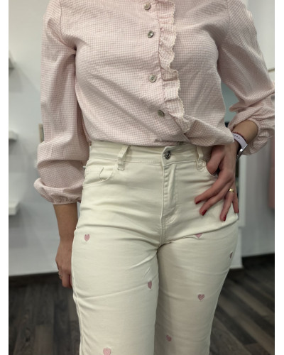 Pantalón de tiro alto con corte flare, ideal para estilizar la figura y alargar visualmente la pierna. Incorpora delicados bordados de corazones que aportan un toque femenino, original y muy especial a la prenda.