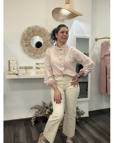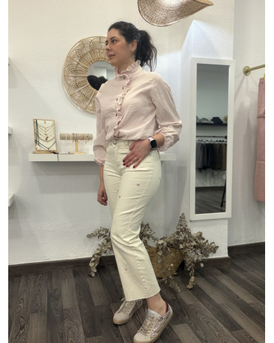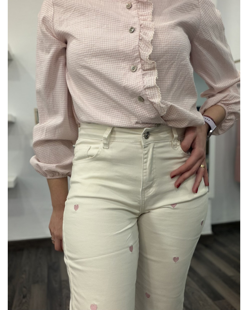 Pantalón de tiro alto con corte flare, ideal para estilizar la figura y alargar visualmente la pierna. Incorpora delicados bordados de corazones que aportan un toque femenino, original y muy especial a la prenda.
