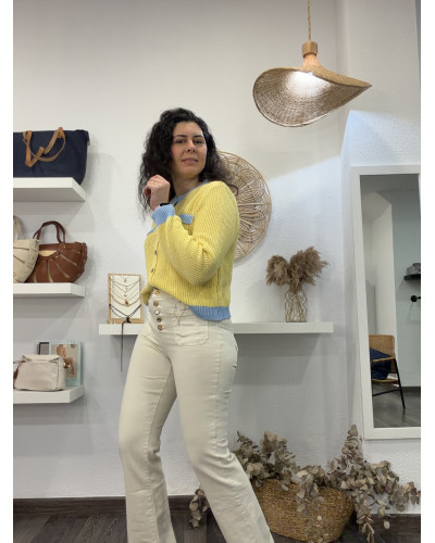 Aporta estilo y comodidad a tu día a día con esta elegante chaqueta de punto fino. Su diseño en amarilla se complementa con delicados detalles en color crudo en el cuello, puños y bolsillos decorativos, creando un contraste clásico y sofisticado.