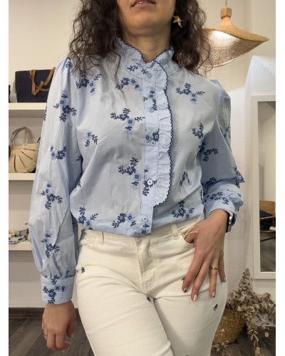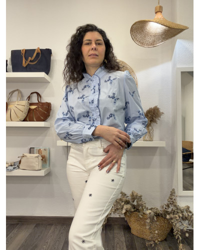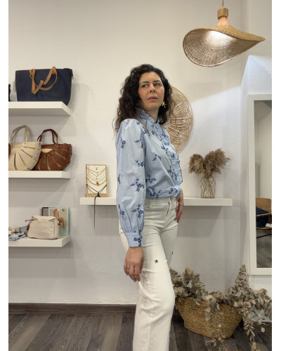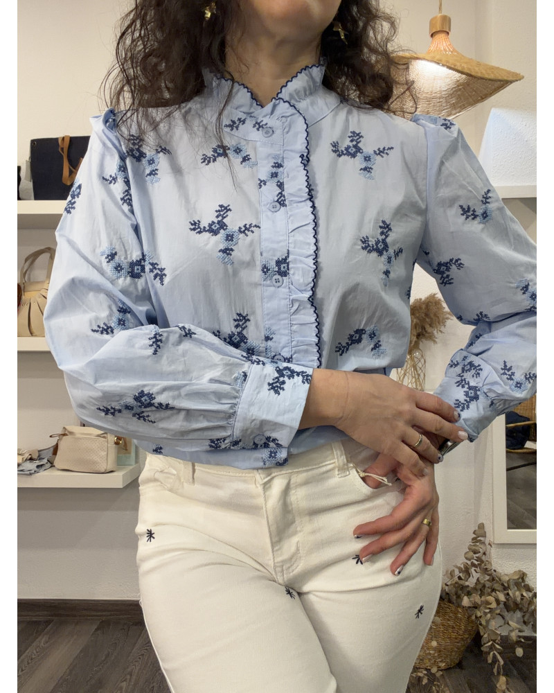 Una prenda clásica con un toque especial. Esta camisa en azul claro destaca por sus bordados en hilo marino, que aportan delicadeza y un acabado cuidado, elevando un básico imprescindible del armario.