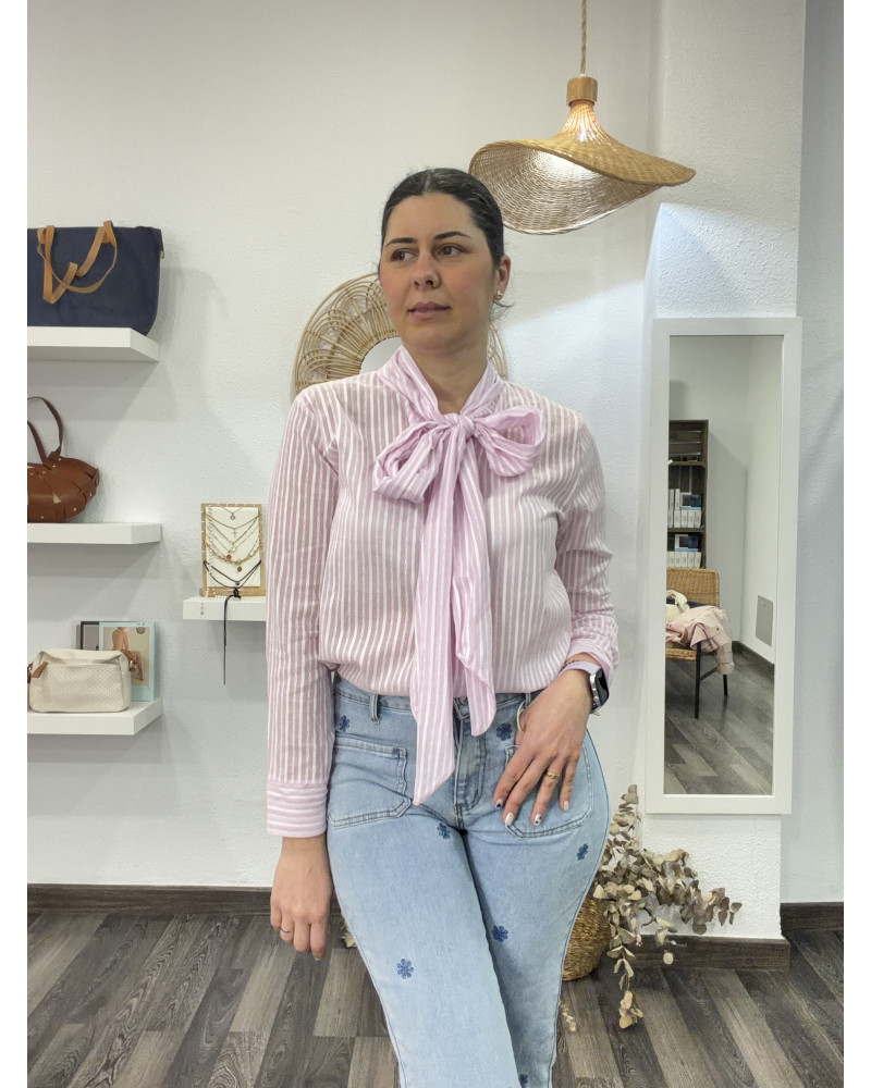 Aporta un toque elegante y femenino a tus looks con esta blusa rosa de estilo romántico. Diseñada con un lazo amplio en el cuello que puedes ajustar según tu gusto, es una prenda ideal tanto para outfits casuales como para estilismos más frontales.