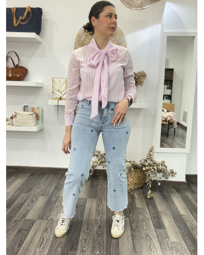 El tejido ligero presenta un delicado diseño de rayas verticales en blanco, con pequeños detalles bordados que añaden textura y sofisticación. Su corte fluido y las mangas largas la convierten en una opción cómoda y favorecedora para cualquier ocasión.