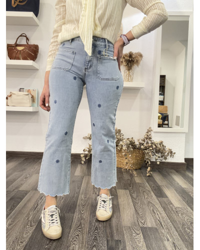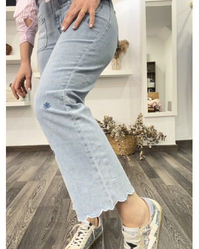 Dale un toque fresco y original a tus looks con este vaquero de corte cropped, decorado con pequeños bordados florales en tono azul. Su diseño combina comodidad y estilo, perfecto para crear outfits casuales con personalidad.