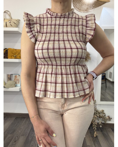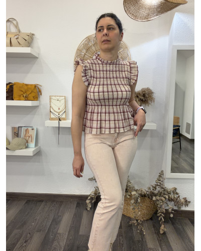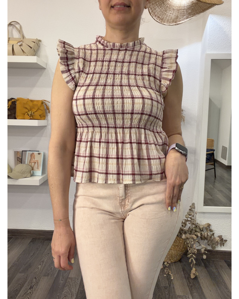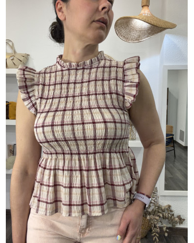 Blusa de cuadro vichy en tonos rosas sobre fondo beige, perfecta para aportar un toque romántico y natural a tus looks del día a día. Su diseño fruncido en el pecho se adapta cómodamente al cuerpo, realzando la silueta sin marcar.
