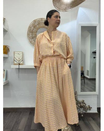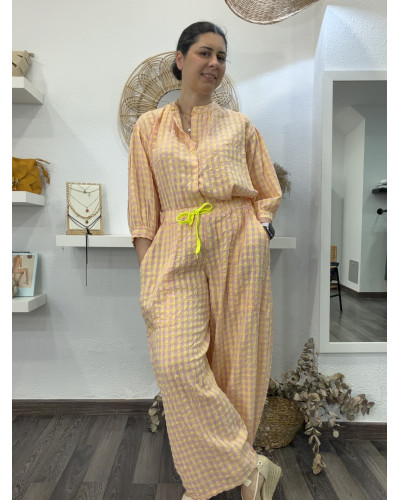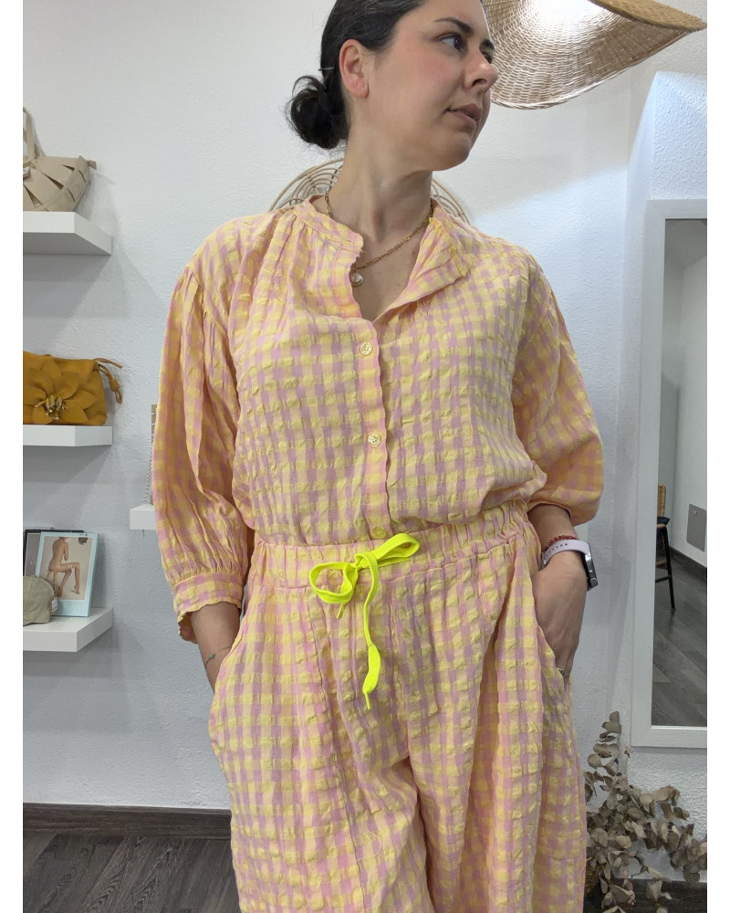 Camisa ligera de cuadro vichy en tonos amarillo y rosa, perfecta para dar un toque de color suave y favorecedor a tus looks. Su tejido fluido y ligero la convierte en una prenda muy cómoda para el día a día.